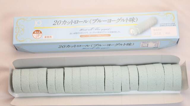 淡い水色のスポンジでヨーグルト風味のクリームを巻きました。